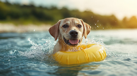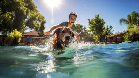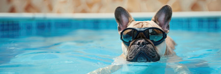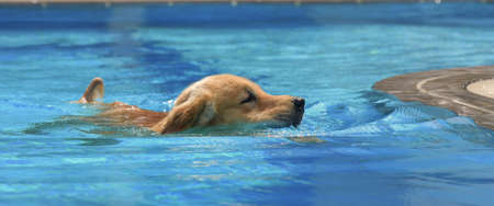 A happy golden retriever swimming gracefully in a sparkling blue pool, showing pure joy and freedom on a sunny day. Ideal image for themes of pet activity and outdoor fun.