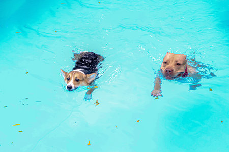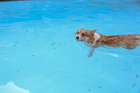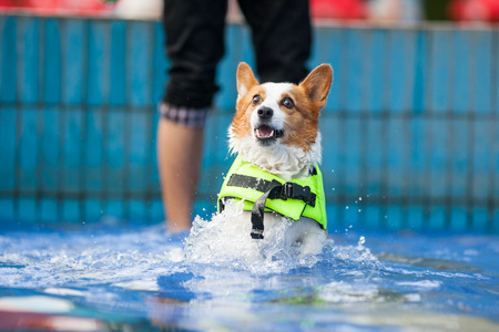Pembroke Welsh Corgi Dog swimming exercise in the pool