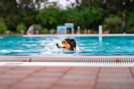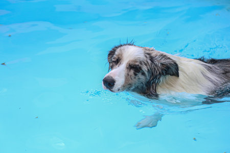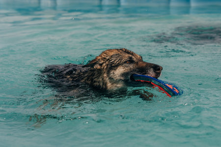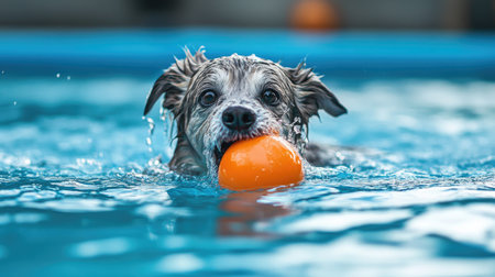 A joyful wet dog swims in a clear blue pool with a yellow tennis ball. This image captures playful summer fun, showcasing energetic outdoor activity and pure canine happiness.