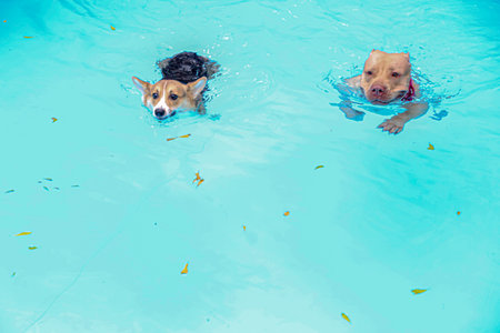 Pembroke welsh corgi dog and bulldog dog are having swimming competition in the afternoon