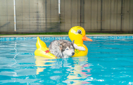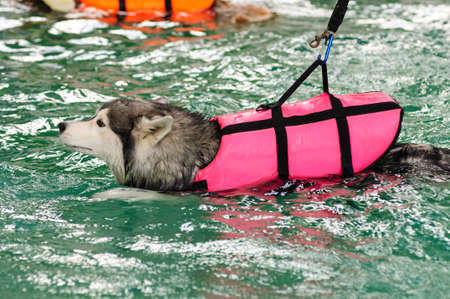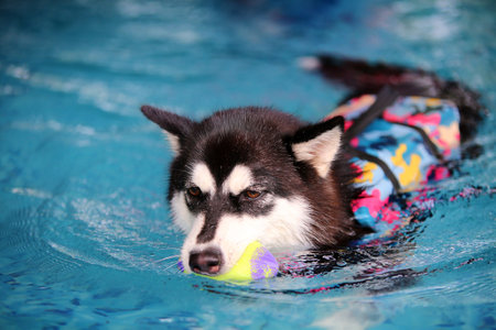 Alaskan Malamute puppy wearing life jacket and hold toy in mouth in the pool. Dog swimming. Dog playing with ball.