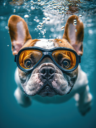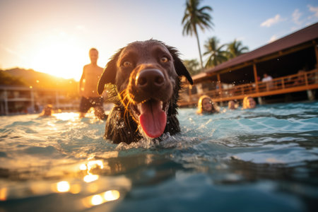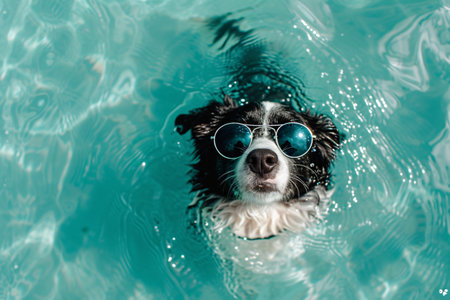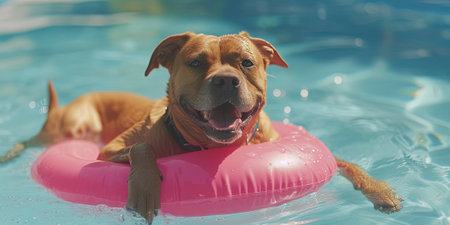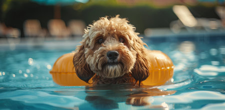 A joyful dog swims in a clear blue pool, surrounded by lush greenery. The scene captures relaxation, outdoor fun, and the simple pleasures of a sunny day.