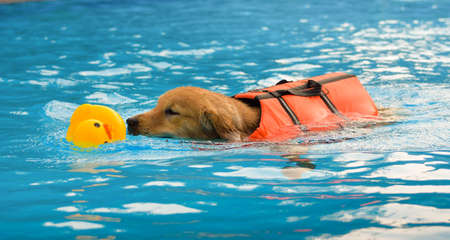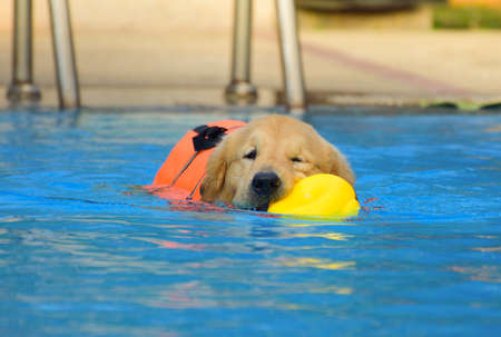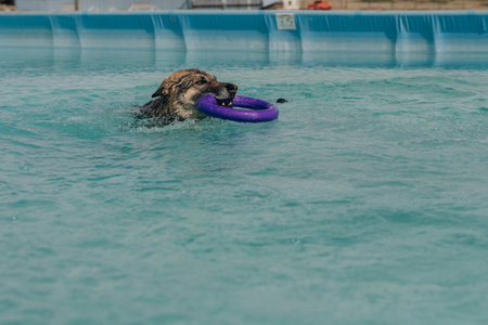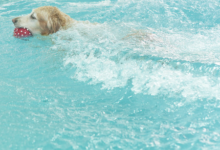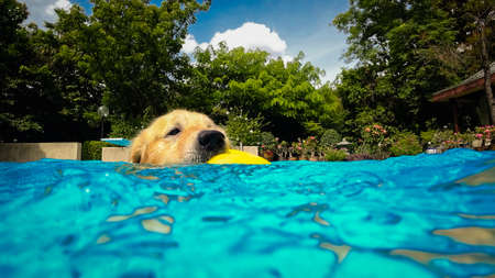 Yellow Labrador retriever swims with a toy in a pool in summer.