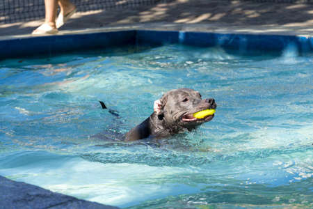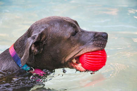 Blue nose Pit bull dog swimming in the pool. Dog plays with the ball while exercising and having fun. sunny day.