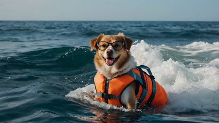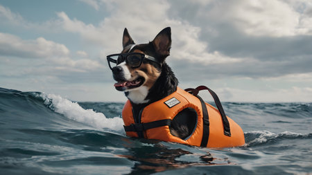 Pomeranian wearing life jacket and swimming in the pool. Dog swimming. Fluffy dog smiling.