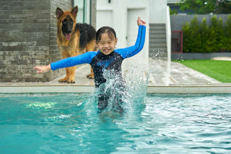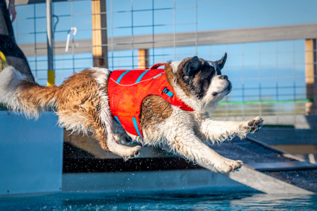 Australian Shepherd dog jumps into a swimming pool with a life jacket.