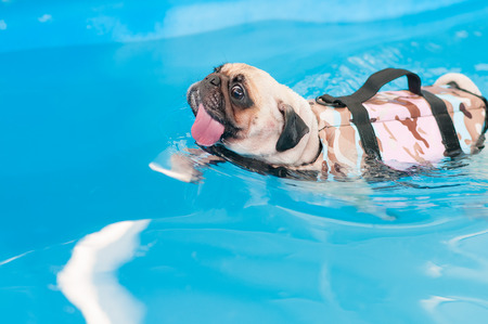 rear view of a cute dog Pug swim at a blue local public pool with life vest