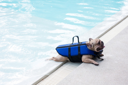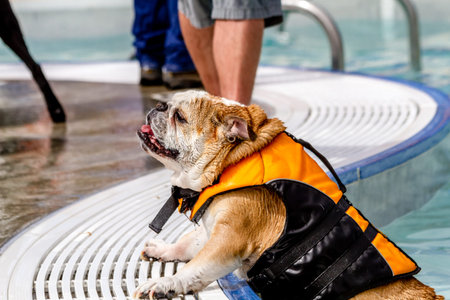 English bulldog climbing out of water at local swimming pool wearing canine life jacket with human assistance