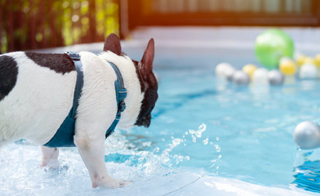 Back view of cute little French Bulldog ready to jump into swimming pool. Dog training and exercising.