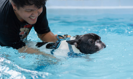 Smiling man helping his black and white French bulldog to swim in the swiming pool. Dog learning to swim concept.