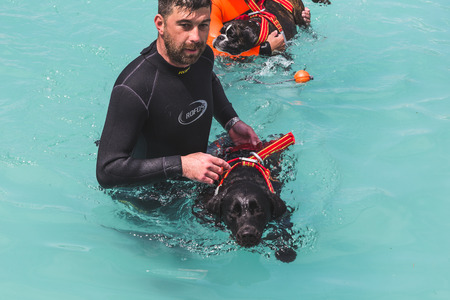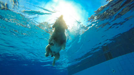 MILAN, ITALY - JUNE 12: Dog enjoys the swimming pool at Quattrozampeinfiera, event and activities dedicated to dogs, cats and their owners on JUNE 12, 2016 in Milan.
