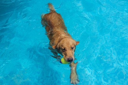 Labrador Retriever swimming in water of pool with tennis ball in mouth