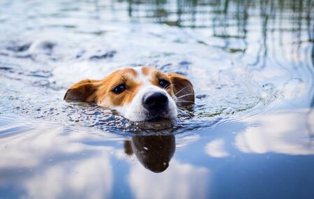 portrait cute a Corgi puppy with big ears swims funny in a blue lake on a hot summer day pulling its face out of the water