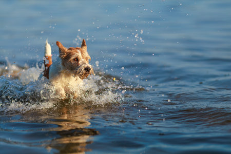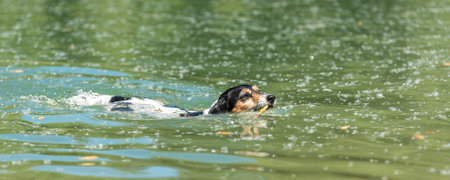 Small cute Jack Russell Terrier dog swims with joy in water and carries a branch in his mouth