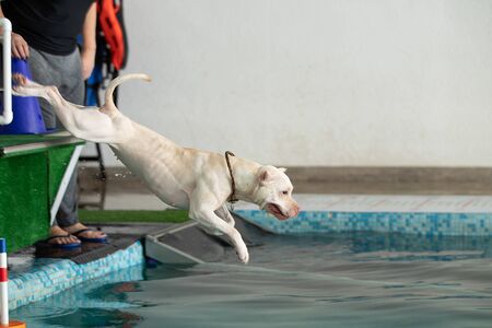 Jack Russell in the water sports pool. A dog handler teaches a dog to swim