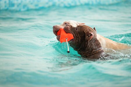 Dog swimming in the pool with a toy in his teeth.pit bulls and Labradors in the water
