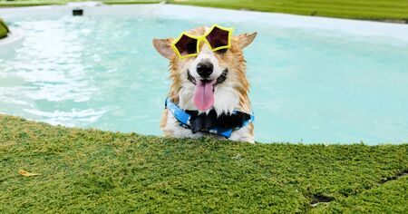 adorable welsh corgi dog smile face wear yellow sunglasses in swimming pool at weekend