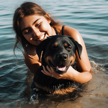Young woman enjoying a beautiful summer day at the beach with her rottweiler. The natural scenery of the shore and park add to the beauty of the moment, as they enjoy the outdoors and the pure happiness of being together. Generative AI