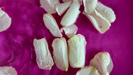 Peony petals on a pink concrete
