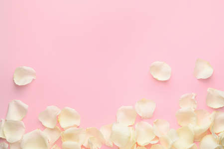 Beautiful white rose petals on color background