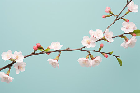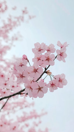 A beautiful close-up of a cherry blossom branch showcasing delicate flowers against a soft blue background, evoking a sense of tranquility and freshness in spring.