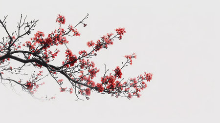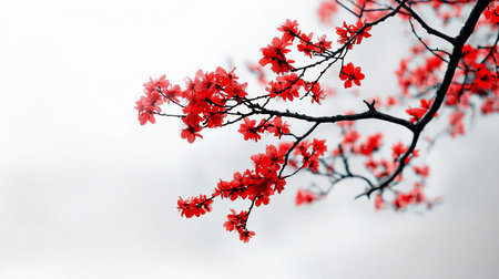 Captivating image of fiery red flowers, commonly known as the 'Flame of the Forest', set against a minimalist white backdrop. The vivid hues and the graceful silhouette of the branches provide a striking visual that embodies the passion and energy of the natural world.