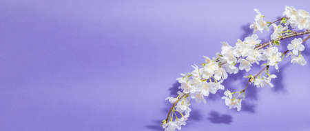 Blossoming cherry twig isolated on purple very peri background. Amazing spring blossom, Easter or Wedding gentle concept, banner format