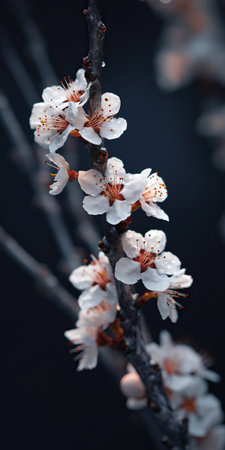 This image features a branch with pale pink blossoms contrasted against a very dark background. It evokes a sense of fragile beauty and serene, understated elegance.