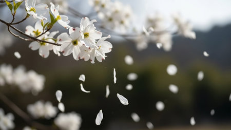 Blossoms showing delicate white dogwood blossoms falling from branches against a softly blurred natural background...
