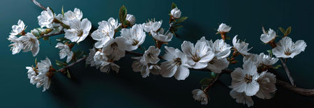 Lush cherry blossoms sit on a pastel light mint background, creating a peaceful scene with copy space, ideal for branding or creative mock-up use, banner