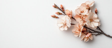 Vibrant peach blossom branches laid flat, symbolizing growth and renewal, beautifully arranged on a white background