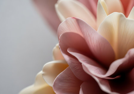 A stunning close-up image showcasing the intricate details of soft pink and white flower petals, emphasizing their gentle curves against a soothing background.