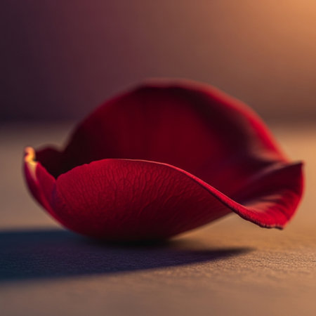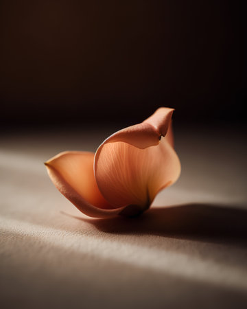 A delicate flower petal rests softly on a textured surface, showcasing the elegance of nature with gentle lighting and soft shadows. The minimalist composition emphasizes beauty and fragility.