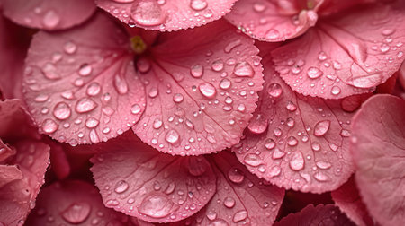 Water drops on pink hydrangea petals. Natural background.
