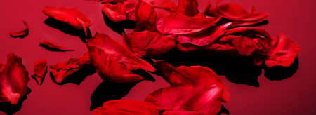 Design concept - top close up view of a lot of red rose petal pattern on pink background for mother, wedding and valentine day mockup