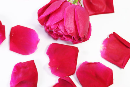 Pink roses petals on white background, close-up. Beautiful red rose flower petals. Valentines day flowers