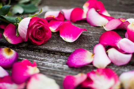 Rose petals on Wooden Background for Happy 8 march and Womens day. copy space