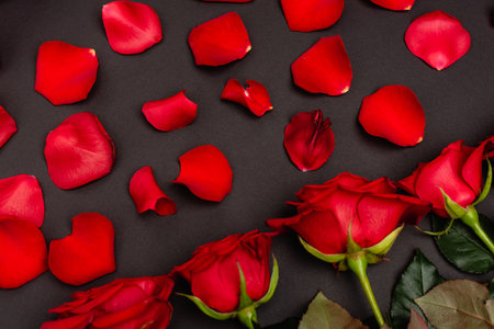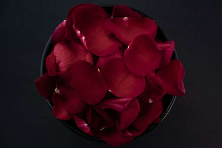 Red rose petals in a black plate on a dark background. Floral background. Valentine's day love concept.
