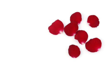 Top view of red rose petals isolated on white background. Copy space