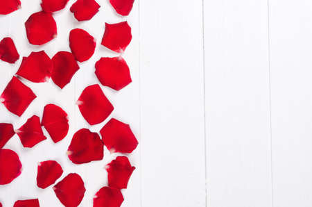 Red rose petals on white wooden background