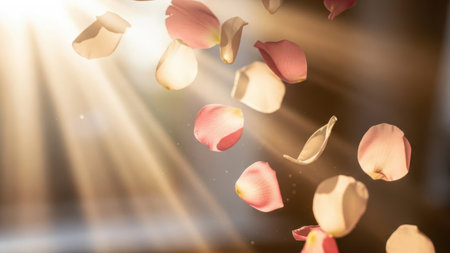 A stunning view of vibrant rose petals captured mid-air, glowing under soft natural light, creating a romantic and dreamy atmosphere for any floral-themed project.
