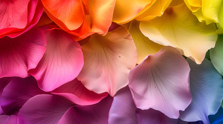 This detailed and realistic macro photograph captures rose petals in various colors, arranged to form the distinct pattern of the rainbow flag With a vibrant color palette and natural textures, the