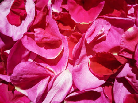 Multi-colored red, yellow, delicate rose petals on a pink pastel background. Flat lay, pattern, top view.