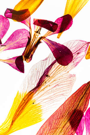 Gently pink petals of tulips or roses flowers on a white isolated background.