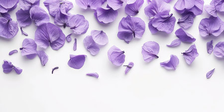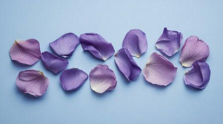 A serene arrangement of purple rose petals scattered over a soft blue background. This image evokes feelings of tranquility, beauty, and romance, perfect for floral designs or decorations.