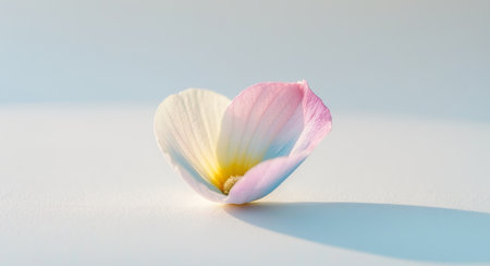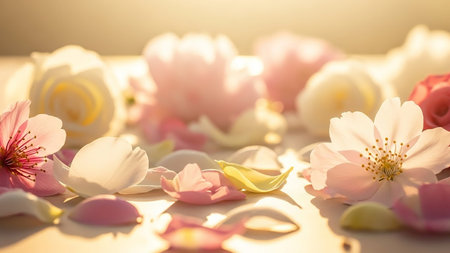Gentle showing delicate pink and white rose petals scattered on a light surface illuminated by soft golden sunlight creating a romantic and serene atmosphere...