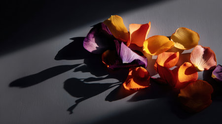 This image features an elegant arrangement of vibrant flower petals, beautifully illuminated by soft light and creating gentle shadows, perfect for a serene atmosphere.