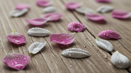 Delicate showing delicate pink and white flower petals scattered on a rustic wooden surface with water droplets....