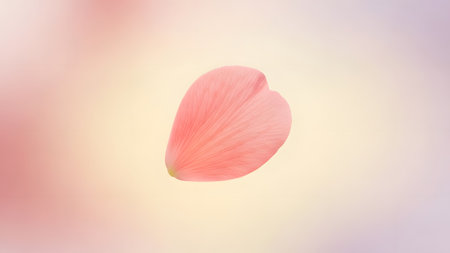 This image captures a solitary pink flower petal suspended in mid-air, set against a soft, pastel-colored background. The petal, with its delicate texture and gentle hue, appears to be floating serenely, evoking a sense of tranquility and beauty. The blurred, gradient background enhances the petal's prominence, creating a dreamy and ethereal atmosphere.