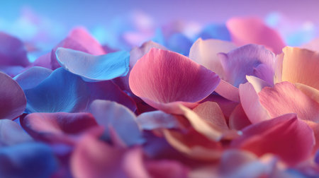 A serene scene featuring delicate rose petals scattered on a soft blue surface, illuminated by ethereal light and shadows, ideal for romantic projects or decor.